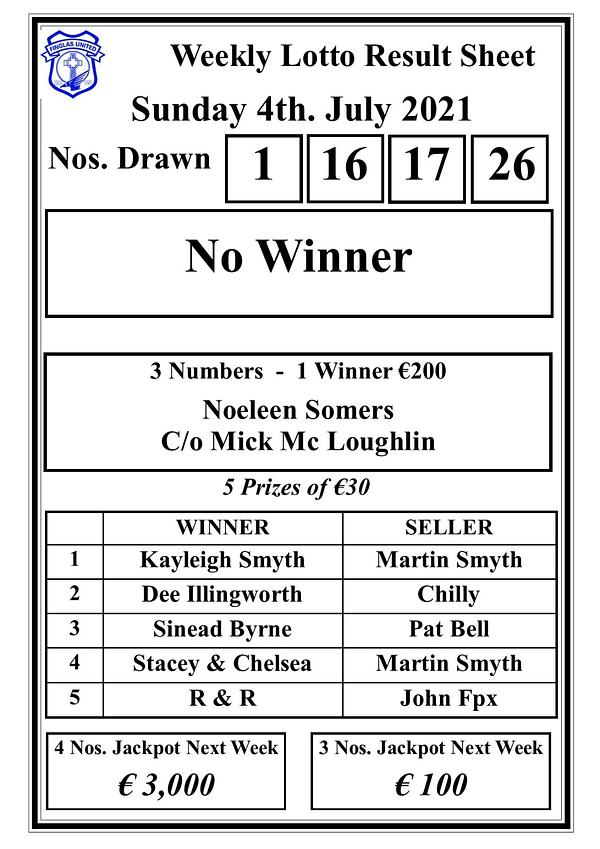 There was no winner of last Sunday's club lotto jackpot worth 2750 , the winning numbers were 1,16,17 and 26